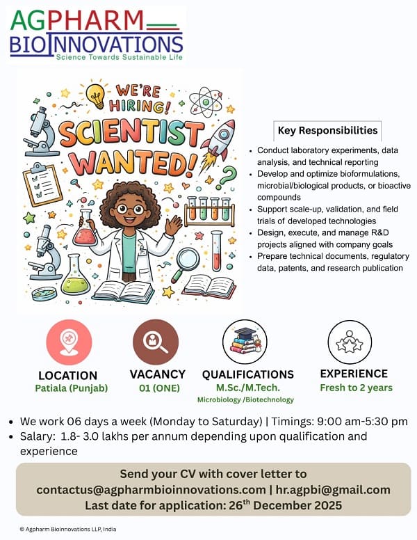 Please send your CV and certificates with a cover letter to: Head, Human Resources, AgPharm Bioinnovations LLP only through email at contactus@